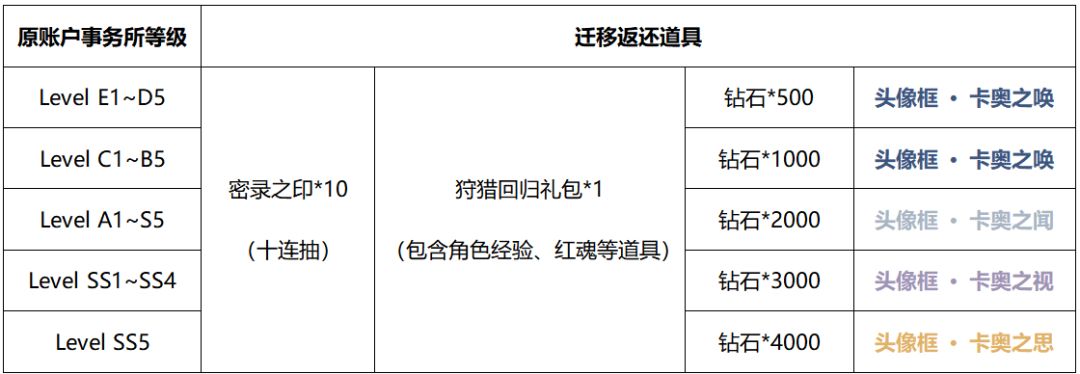 2.迁移福利:在老用户专属迁移返还区服“红墓市”中,将根据原账户事务所等级发放对应的钻石、限定头像框。
