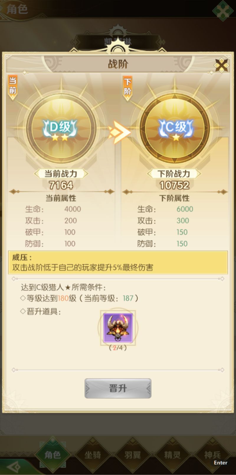 1.战阶达到C级猎人1星