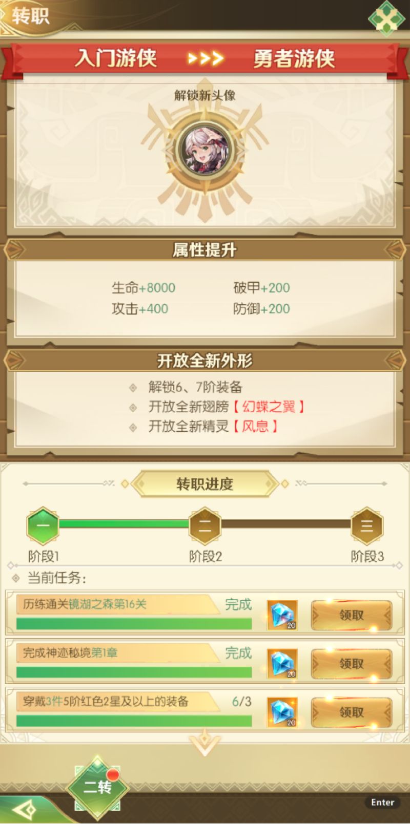 需求条件:180级,达成二转
