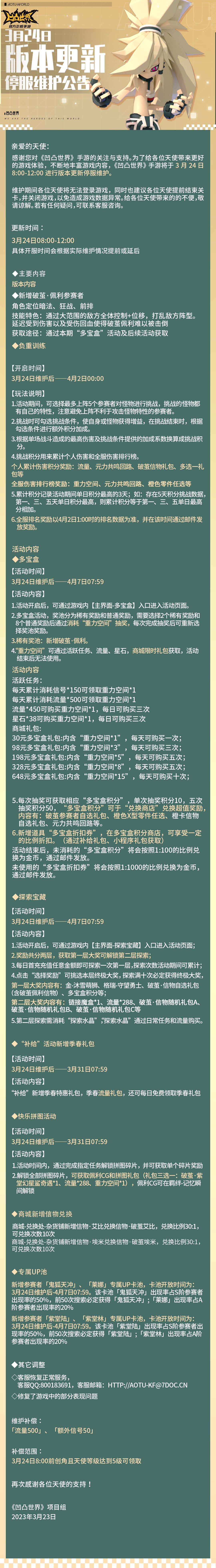 感谢您对《凹凸世界》手游的关注与支持。为了给各位天使带来更好的游戏体验,不断地丰富游戏内容,《凹凸世界》手游将于3月24日8:00-12:00进行版本更新停服维护。