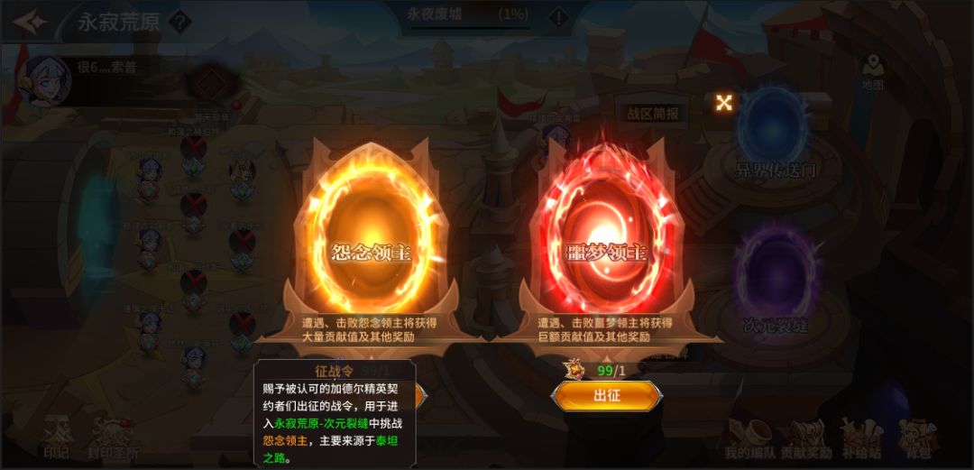 主界面内点击“次元裂缝”可参与次元裂缝挑战进行领主封印,获取丰厚的奖励;挑战次元裂缝需消耗道具“征战令”或“噩梦征战令”——“征战令、噩梦征战令”来源于泰坦之路系统