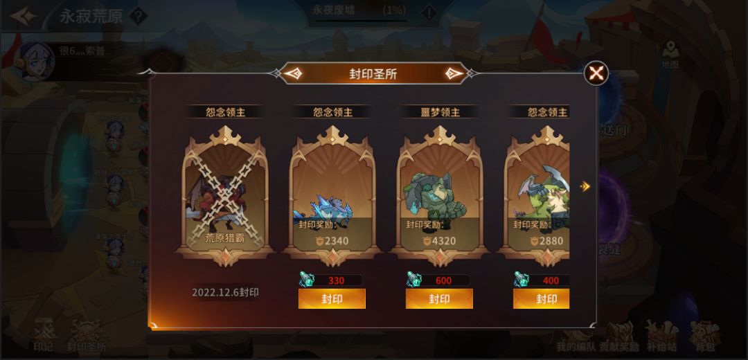封印圣所内将展示“异界传送门、次元裂缝”中击败过的领主,并可消耗“封印石”对齐进行封印,成功封印后将获得贡献值奖励