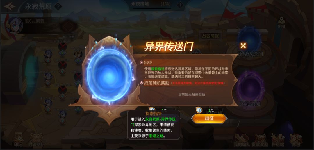 主界面内点击“异界传送门”可参与异界门挑战,挑战异界门需消耗道具“探索指针”——“探索指针”来源于泰坦之路系统;首次通关后即可消耗“探索指针”进行扫荡快速获得奖励