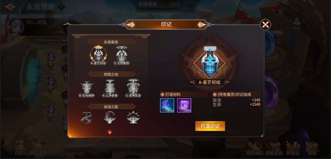 通过异界传送门、次元裂缝可获得“月露石、隐月鉴”等相关操作,用于进行印记打造,点击左下角“印记”按钮即可进入印记功能消耗材料打造印记,成功打造印记后将获得对应的属性加成