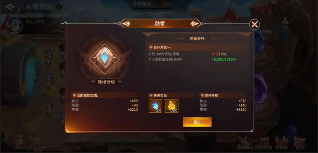 点击头像右侧的“勋章”图标,即可查看当前勋章的属性加成,以及下一阶段勋章的晋升条件和加成属性