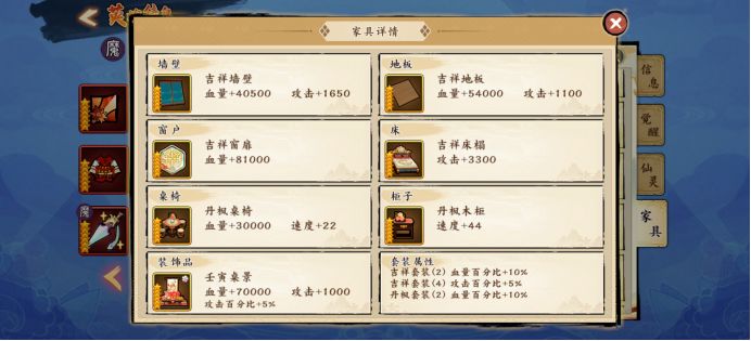对于家具的话,我现在普遍建议上4吉祥和2丹枫,桌椅和木柜是所有家具里面速度最高的,而吉祥的攻击力高,以及壬寅提供的百分比攻击力都非常不错,4件套和2件套提供的攻血百分比加成都能大大提升春花的面板。