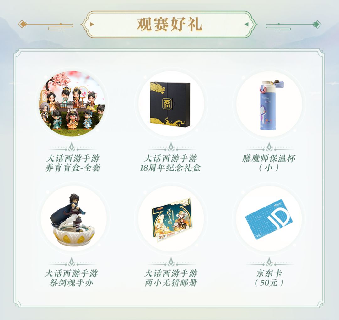 锁定官方直播间观看比赛直播,更有精彩好礼掉落!观看本届超级联赛,即有机会获得大话西游手游养育盲盒-全套、大话西游手游18周年纪念礼盒、膳魔师保温杯(小)、大话西游手游祭剑魂手办、大话西游手游两小无猜邮册、京东卡(50元)等观赛好礼!