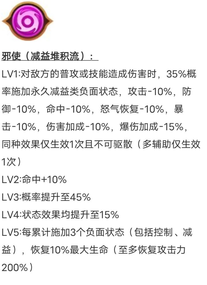 ①对敌方的普攻或技能造成伤害时,概率施加攻击-10%,防御-10%,命中-10%,怒气恢复-10%,暴击-10%,伤害加成-10%,爆伤加成-15%的永久减益类负面状态