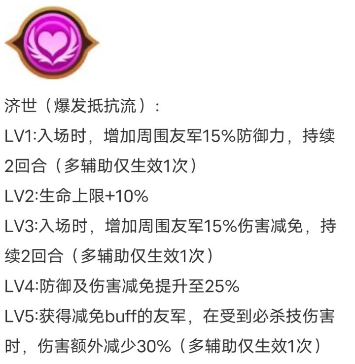 辅助济世职业特性为减伤,适合所有辅助转职,入场时拥有两回合伤害减免和防御提升,极大提高己方阵容坦度,保证前两回合生存能力,使己方英雄不至于未释放技能直接阵亡