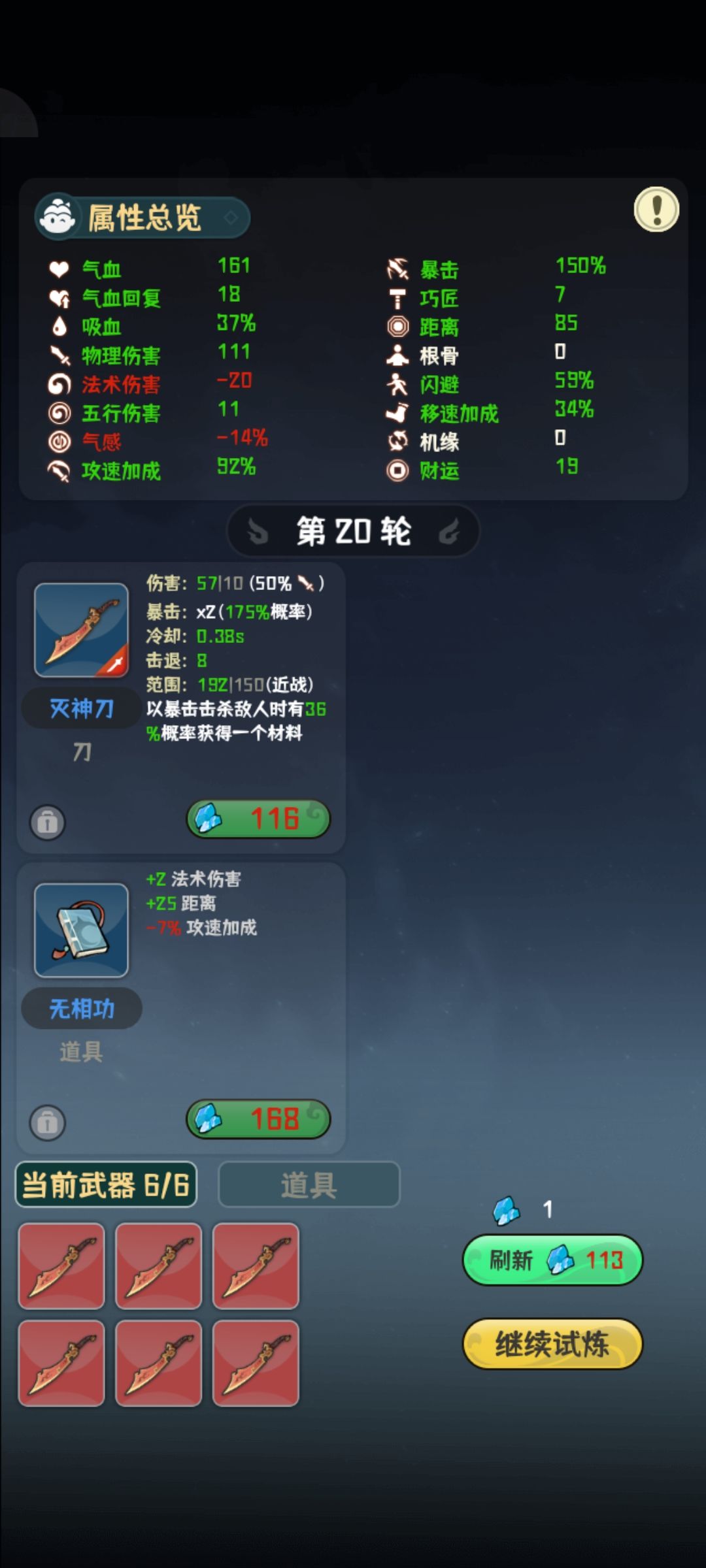 再就是我用六刀刷钱,钱多了,自然可以买的道具加成越多。我也是跑了好多次才通关炼狱模式。
