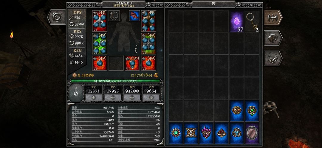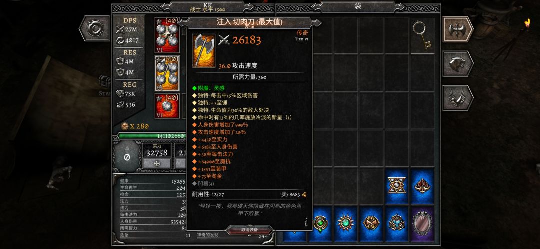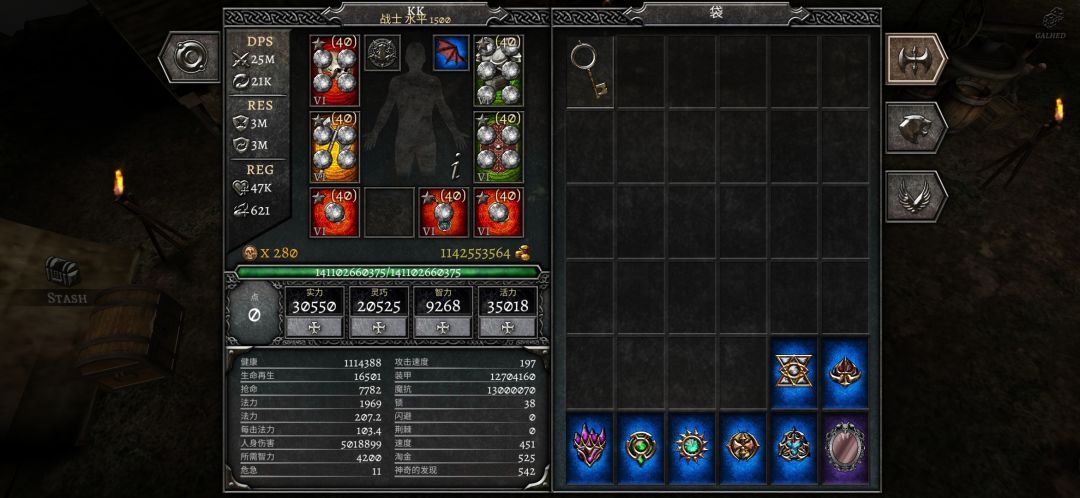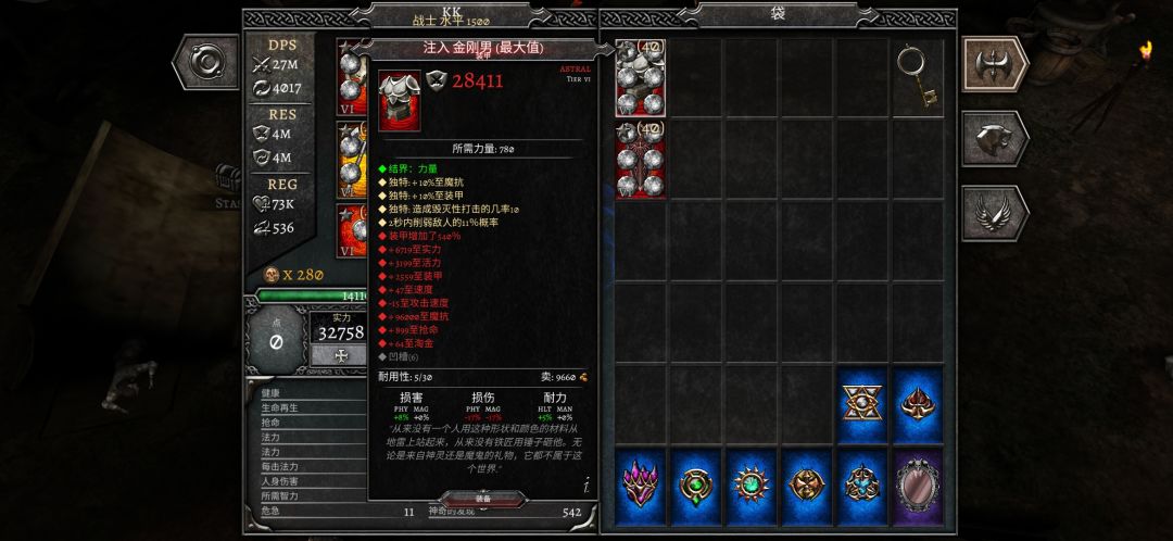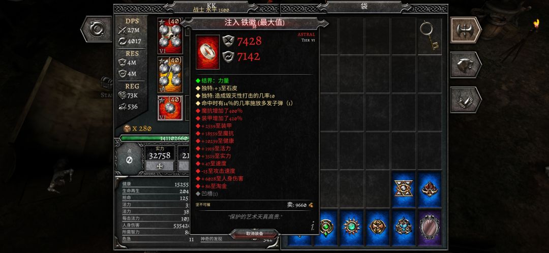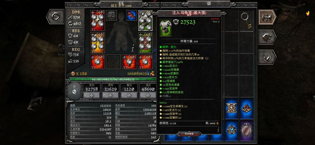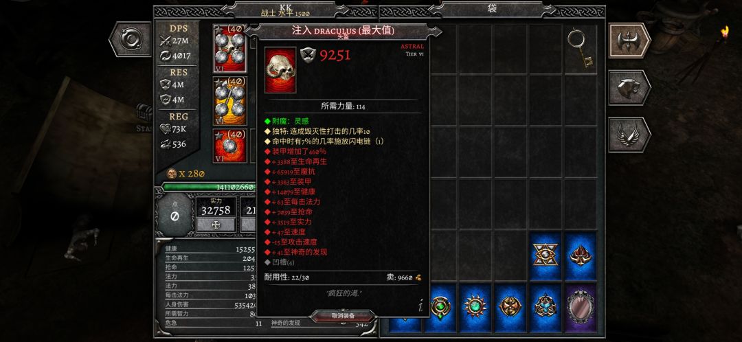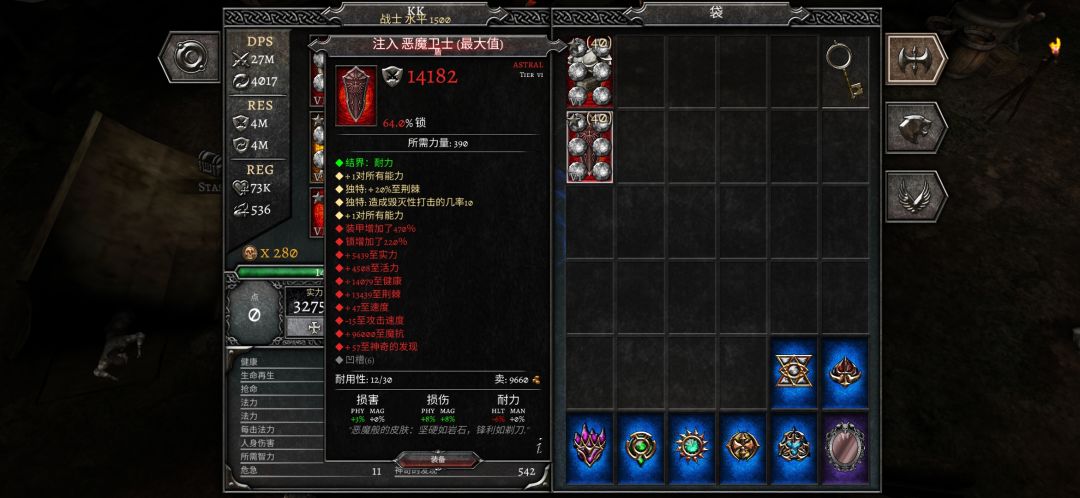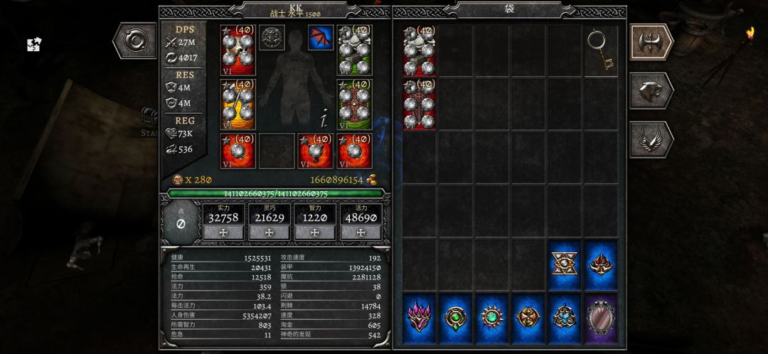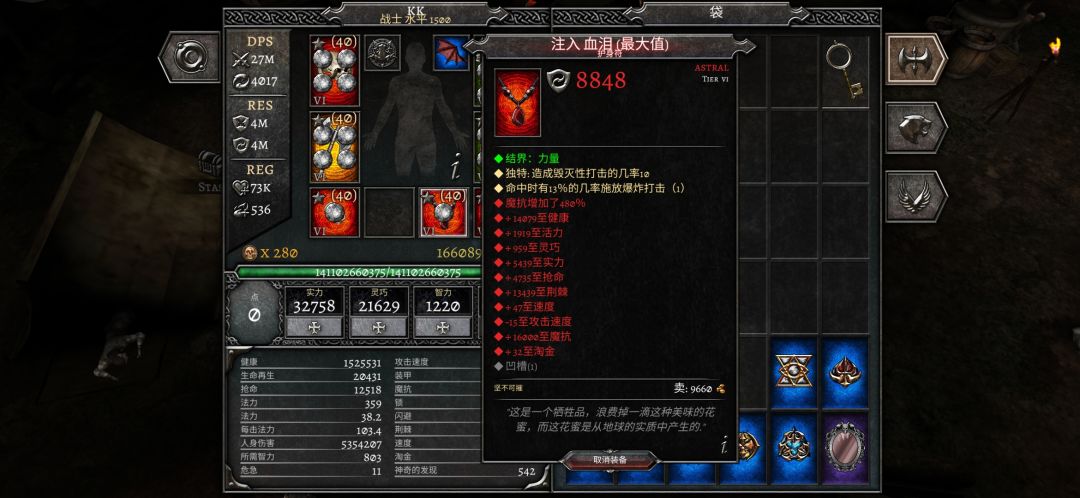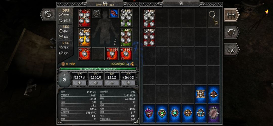 有朋友说我的魔抗太低了,于是我重新洗了点,将90%加到了智力上,项链也换了,现在面板是这样的,在R29依然很肉,文中的属性信息截图都是没改前的。