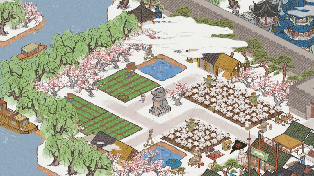 西北的凉亭是阿北与蓓儿奔现之地,亦是二人伤心之所。每次阿北管理鱼塘,总会找个理由于此小憩。亭中座下琴音,田埂蛙叫虫鸣,仿佛仍在耳畔绕萦。如今他虽为应天府务农大户,坐拥棉田鱼池,然佳人已适,城中诸柳,终成托思。