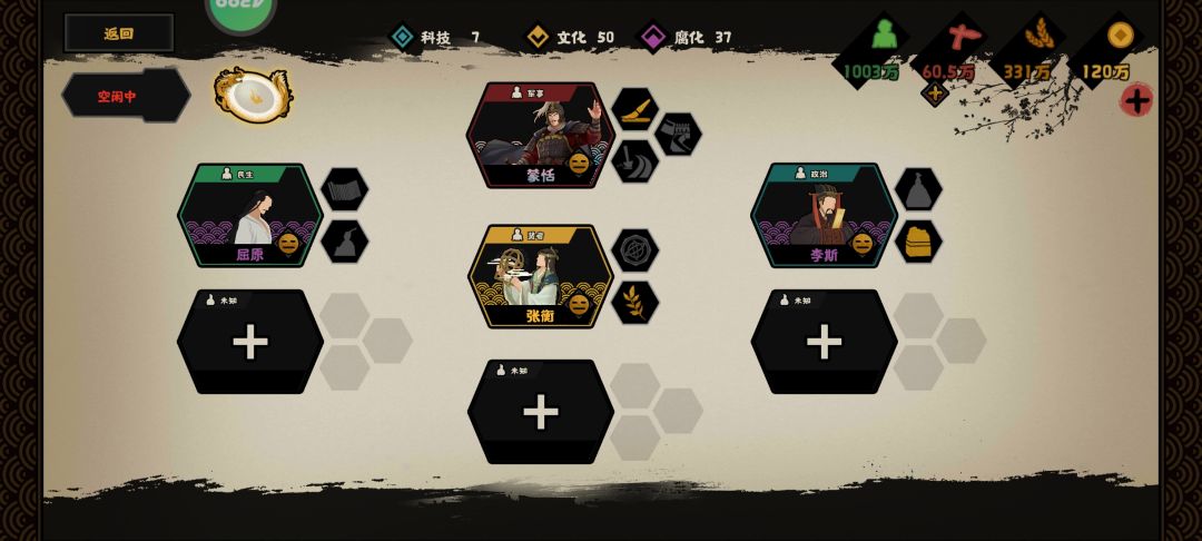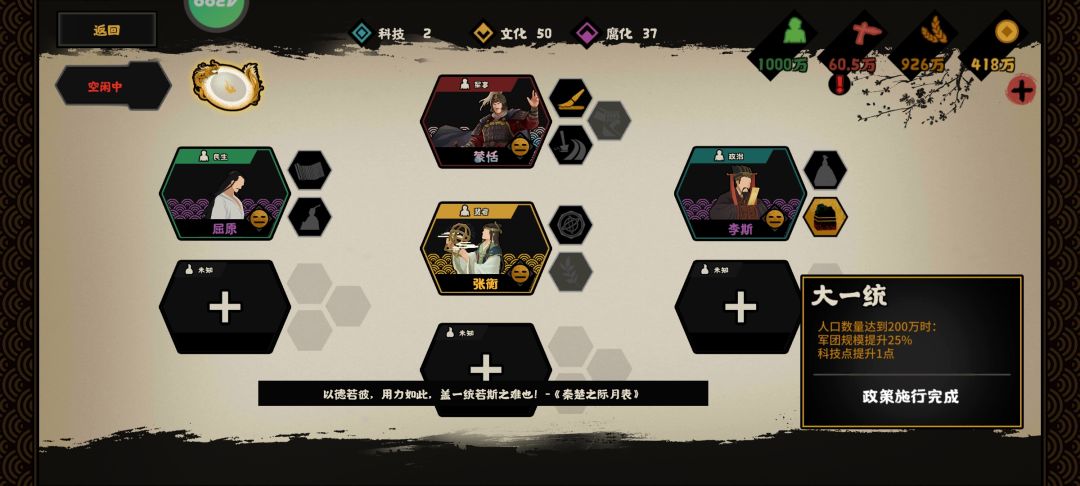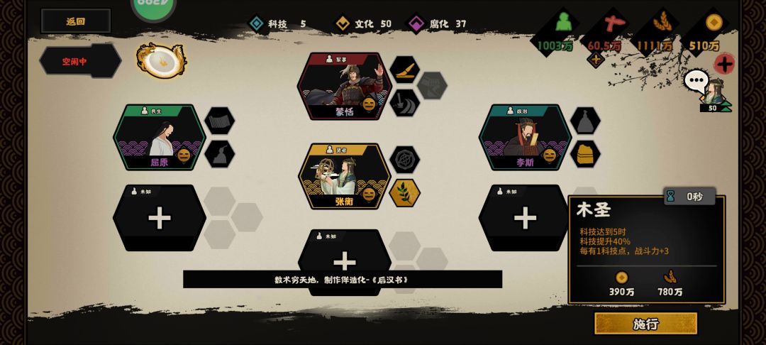蒙恬的“制笔”和李斯的“大一统”开局就可以点出来2科技点,再从时代政策里点出来3科技就可以施行张衡的“木圣”,科技进而突飞猛进。