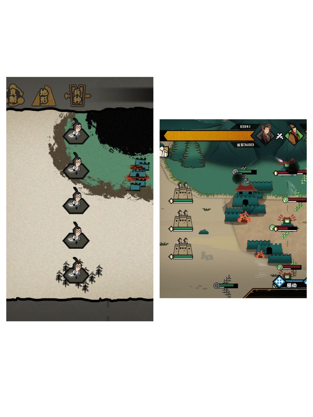工事的机制也很特殊,如果是由非弓兵军团触发,则会留下一个空的工事,其他军团和后续的弓兵军团无法进入。如下图,三个弓兵军团中间隔了两个步兵军团,可以正常生成三个工事,但是只有中间那个弓兵军团可以进入工事。