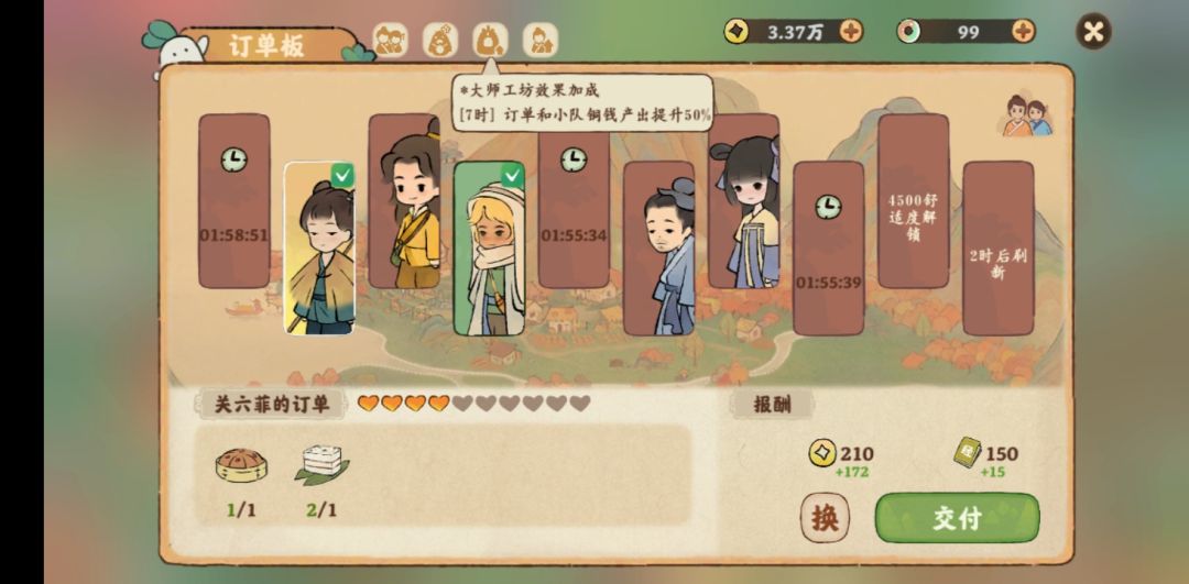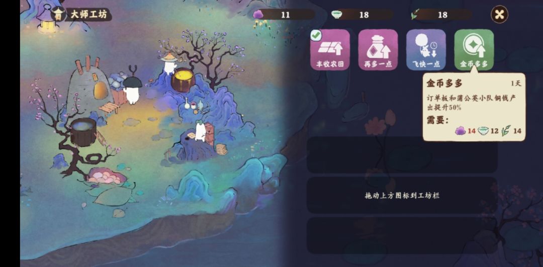 大师工坊选择再多一点提高产能,再选择金币多多提高赚钱效率。
