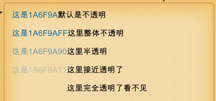 ------后2位数字可以从0-9和ABCDEF中取值,表示透明度。如:都是#1A6F9A的情况下,后两位数字不同的情况:最下面一行是#1A6F9A00,完全看不见了。