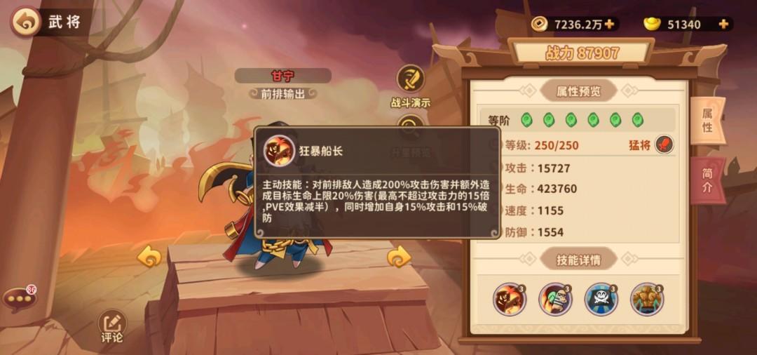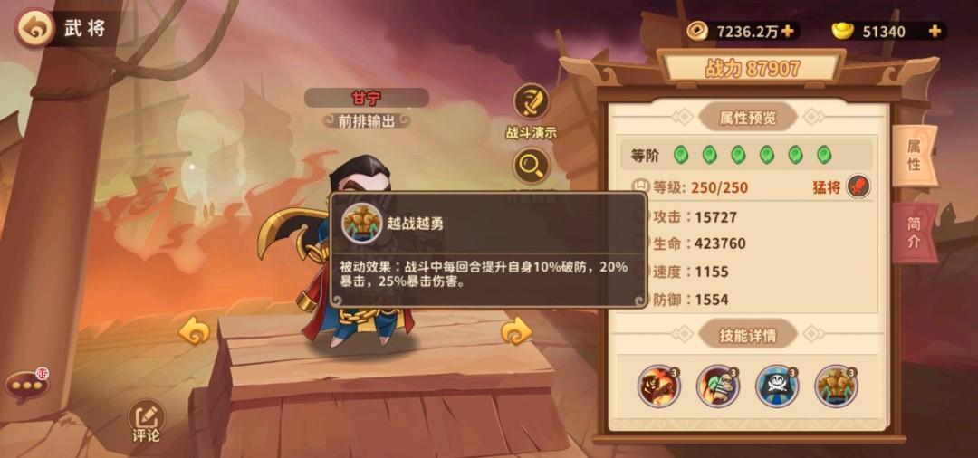 甘宁厉害的原因是因为,他的技能造成10%敌方血量上限伤害,并且每回合增加破防,暴击和暴击伤害。是不是很牛逼!!!