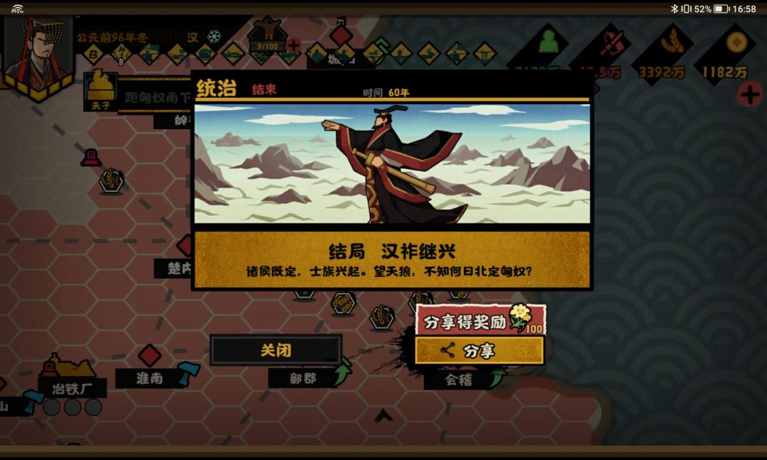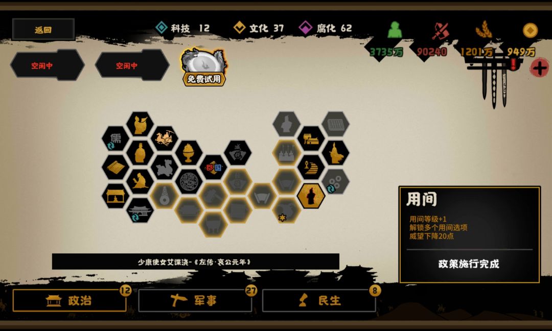 这期间的钱粮一直都处于入不敷出的状态(一开始就点了太多军事了),用了几个物资车,之后打下一座城就选加钱粮来处理,有姜尚在,民心不怕被降低。
