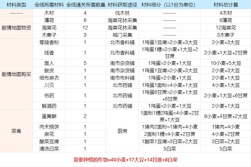 以上就是南有乔木剧情的所有材料啦,材料总结我放在下面请自取~可以看到需要的材料集中在小麦、大豆、甘蔗,大家需要提前规划好种植哦~