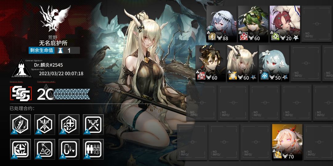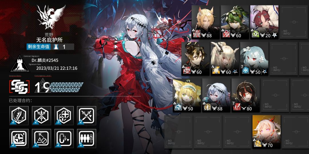 不知不觉打了7个多月的明日方舟了,危机合约也从死活打不过小曼到赝波的18保底人,再到现在的旧约23。原本也只想抄个作业当保底人的,但想到这是最后一次危机合约了,就觉得玩方舟这么多月,养了这么多干员,不就是为了打次高难吗,就开始自己尝试19,20,21从21号打到昨天,一直在试错和换思路,打久了注意力不够了也很容易失误,玩游戏的时间基本都花在这上面了。抛开其他的不说,就从每次合约攻略组的人都勇于登顶来说,是真的很佩服他们(毕竟攻略组的人又不可能靠打这个来谋生,纯粹是因为爱好)。原本以为21已经是极限了,但在b站上看到一个我可以抄的23作业,就从昨晚开始打23,但因为练度低了很多有许多的地方要自己凹,打了几个小时后又发现练度不够,就只打了22,然后开始专精,拉干员等级,直到今天下午才凹过23,这应该是极限了。