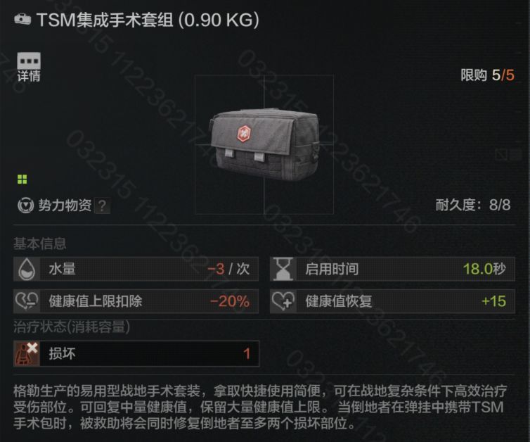 TSM集成手术套组,所占格子2*2,可使用8次,修复的部位会扣除20%健康值上限。当先锋携带TSM集成手术套组进入倒地状态时,被救助起来将会同时修复至多两个损坏部位,可以让先锋从重伤状态下更快恢复。