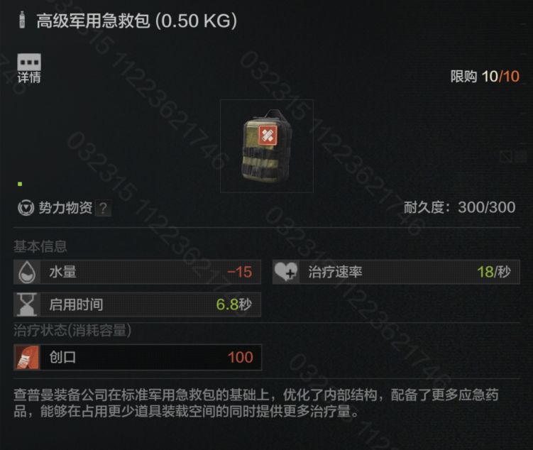高级军用急救包,所占格子1*1,耐久300,启用时间6.8秒,治疗速率18/秒,可消耗100点耐久修复创口,它是标准军用急救包的改进型,优点在于体积小、单格耐久高。