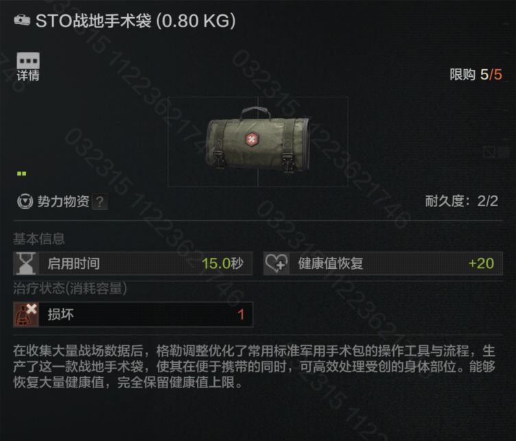 STO战地手术袋,所占格子2*1,可使用两次,修复部位可完全保留健康上限,唯一的缺点是并不耐用。