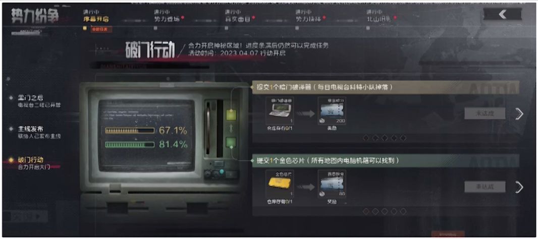整个势力剧情分为5个大阶段,4月初将首先开启第一阶段——序幕。在这个阶段,先锋们的主要目标是收集暗门破译器和金色芯片。暗门破译器可从电视台内科特小队身上获得,而金色芯片则在所有地图的电脑机箱中概率刷新。收集到后先锋们可以在活动界面进行提交,提升全服进度条。二者的进度条达到100%后可开启电视台二楼新区域。