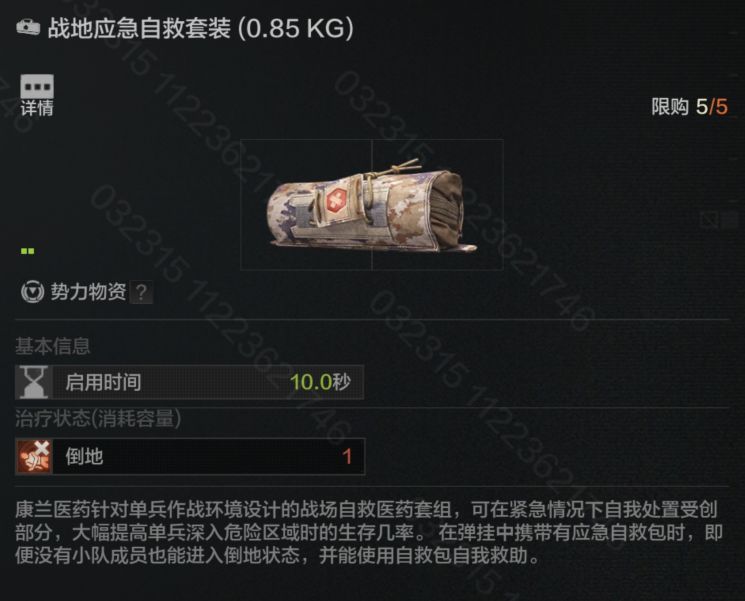 战地应急自救套装,所占格子2*1,耐久度1,使用时长10秒。携带这个道具后,即便没有队友,受非致命重伤后也不会直接被淘汰,而是进入倒地状态,此时可以使用战地应急自救套装从倒地状态中恢复。