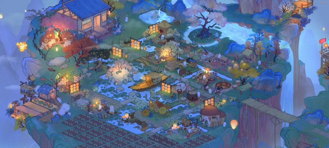 up的船是不是很有意思,实际上这个布局终点就是水池+地面引导+灯与花丛,其中道路负责引导视线和走动路线,花丛灯,竹桥,荷花,加上up的船和樱花,组合在一起就非常美了,水池可以有规划的乱涂,这样随机性大且不容易刻板,然后加上石桥或者竹桥跨水链接各个陆地,在晚上的时候配合花灯和路灯营造温馨的气氛