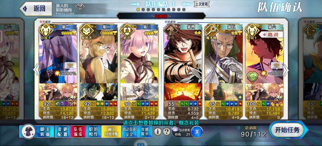 首先使用万能的 c狐+倍卡王姐+c呆组合,这个阵容我过了前面所有的高难本,优势在于宝具连携(王姐→c呆→c狐),在c呆二宝的情况下放完一套之后,"三回合5次肃正防御➕2000回血50np"的buff效果足以无脑过大多数关卡