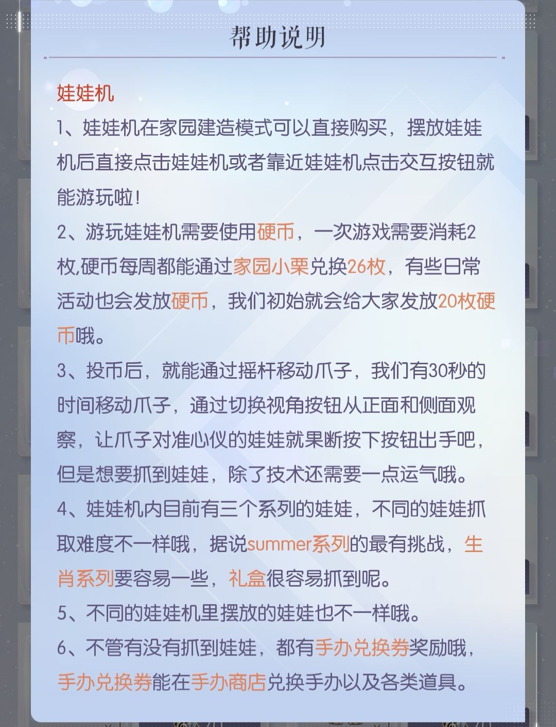 初始赠送20硬币,2硬币抓一次娃娃机,每周用栗子可以换26枚硬币,抓娃娃机获得的手办兑换券可以在〖生活服务〗〖手办商店〗购买三道菜谱。