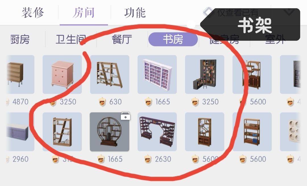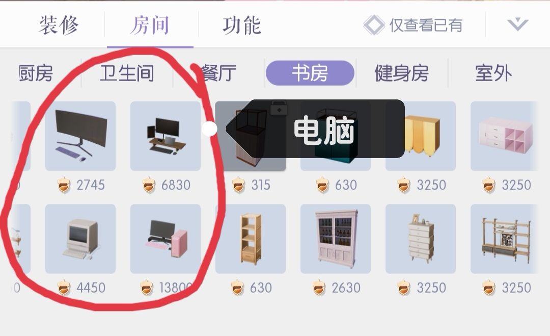 〖建造〗里可以购买家具〖电视机〗〖电脑〗〖书架〗。