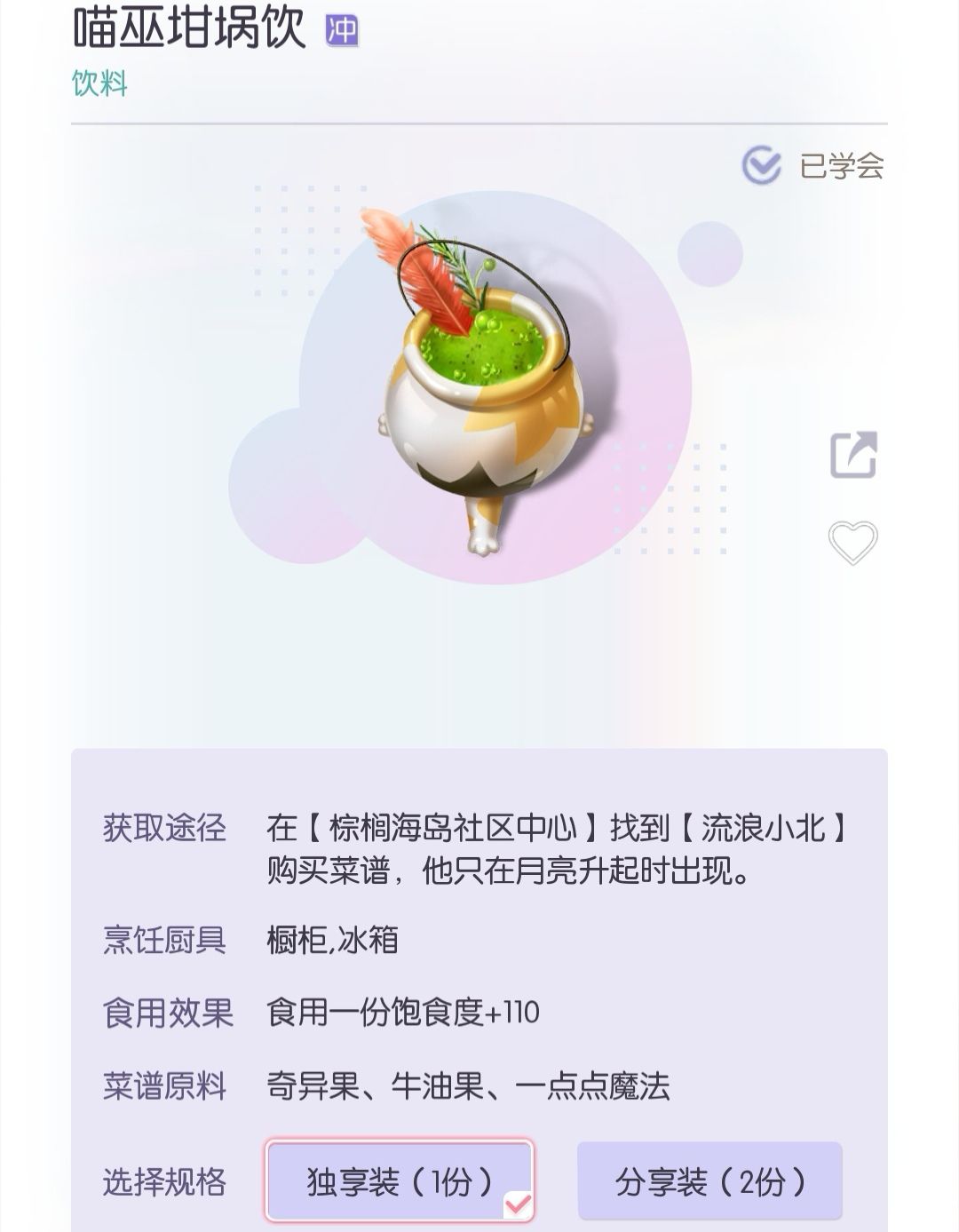 冰箱 中可以查看所有已解锁的菜谱, 饮品 在 冰箱 中制作。