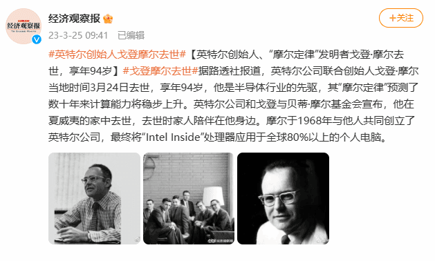 英特尔联合创始人戈登·摩尔去世 曾提出摩尔定律