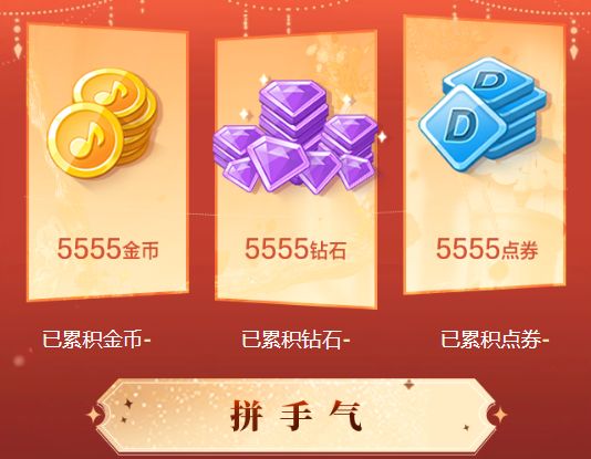 3月25日至4月16日期间,玩家完成任务获得拼手气机会,进行拼手气可以使页面上钻石、点券、金币数量随机增加(每次拼手气只能增加钻石、点券、金币中的一种)。拼手气的奖励会在4月1日10:00:00后开放领取,开放奖励领取后不能再进行拼手气。完成所有任务后,保底可得150钻石、5555点券、5555金币,更有概率赢取5555钻石锦鲤大奖!