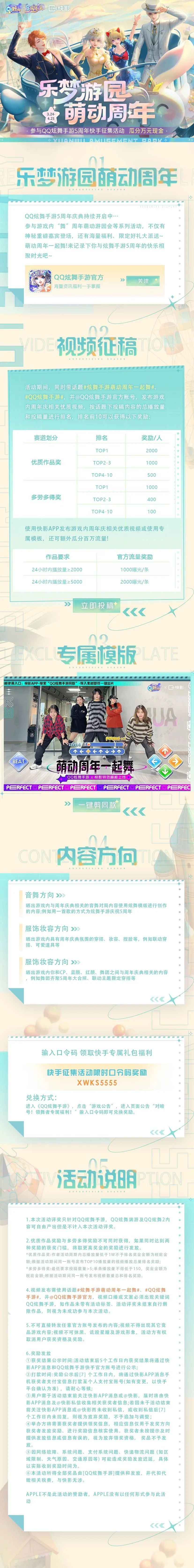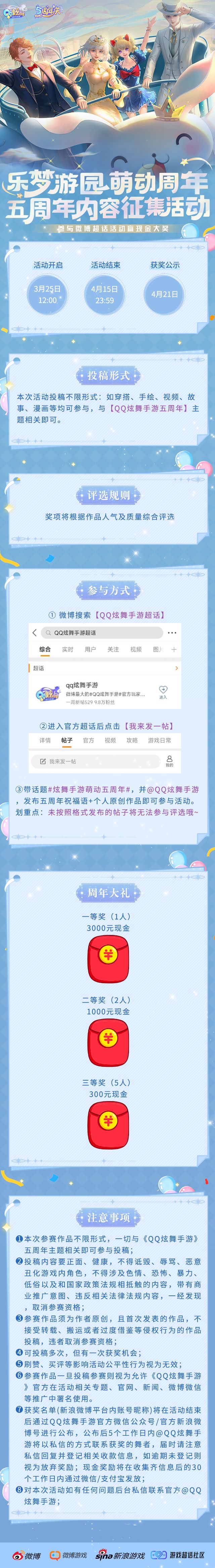 参与方式1.微博搜索【QQ炫舞手游超话】2.进入官方超话后点击【我来发一贴】3.带话题#炫舞手游萌动五周年#,并@QQ炫舞手游,发布五周年祝福语+个人原创作品即可参与活动。划重点:未按照格式发布的帖子将无法参与评选哦~