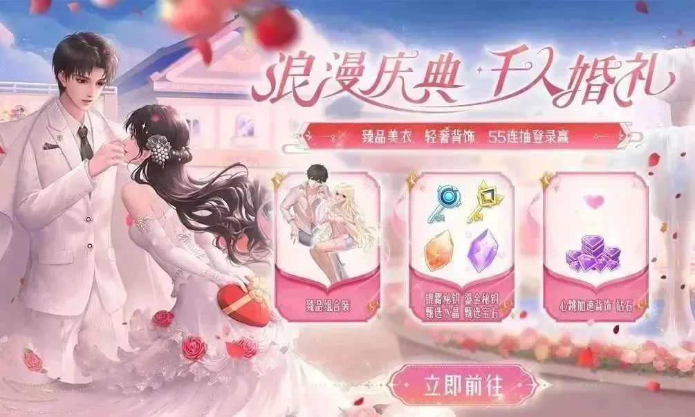 3月25日至4月9日期间,全服累计婚礼数达到1000且期间累登7天可得臻品组合装-迷情夜色,全服累计一定数量的结婚仪式,即可领取浪漫积分、限时抽奖道具等好礼,婚礼场数达到1000后可得心跳加速轻奢部件(所有奖励必须领取当日登录游戏才能够进行领取),分享页面可获得20钻石的额外奖励;此外,玩家可在页面选择自己的好友并表白,成功分享表白还可以获得极光抽奖礼包*5的对应奖励(选择好友时,展示的游戏好友列表为活动开启2周前玩家的好友列表,可能会与现好友列表有一定偏差)。