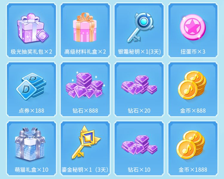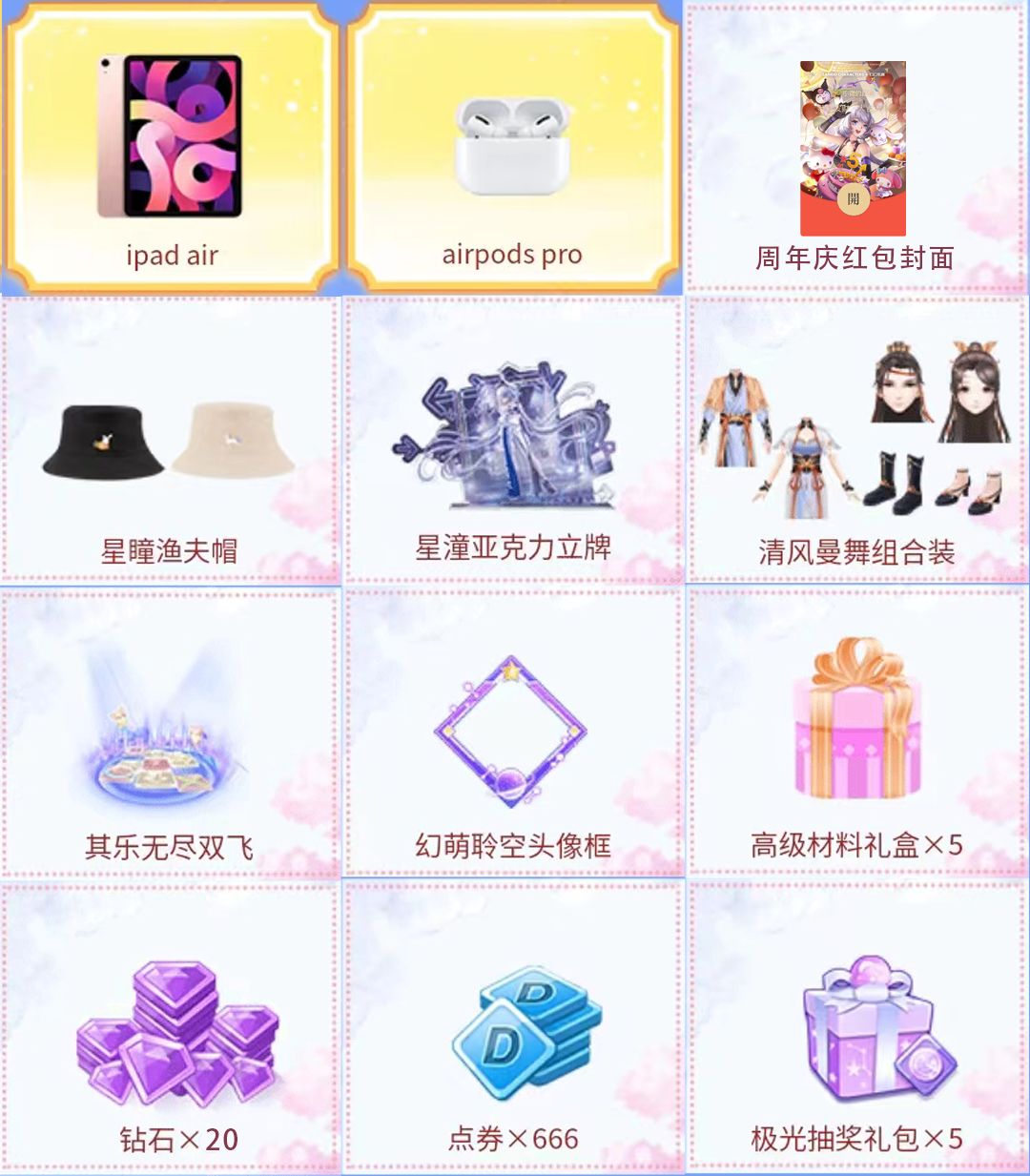 3月24日至3月26日期间,累计登录游戏2天,可得666点券、称号-周年·重回童真年代好礼!当日登录游戏后,可以获得3次抽奖机会,抽完红包抽奖红包抽奖次数后,30分钟后再登录游戏,再次赠送3抽,分享本页面活动还会获得额外2次抽奖机会~每次抽奖有一定概率获得钻石、鎏金秘钥、极光抽奖礼包、高级材料礼盒等奖励。每日的抽奖机会不可用于下一日的抽奖,请尽快使用哦~