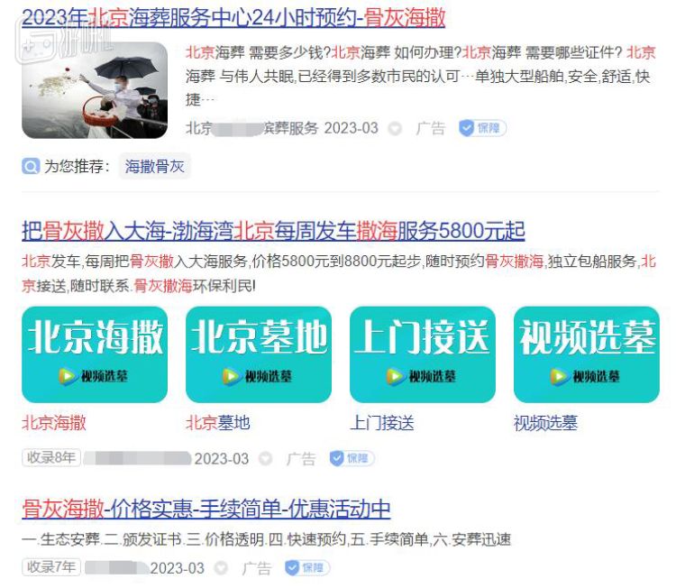 如果不想排队,或者不愿和陌生人一起送别逝者,还可以选择相关公司提供的收费服务。在百度上打出海葬的关键词时,就能看到不少购买了广告位的公司。