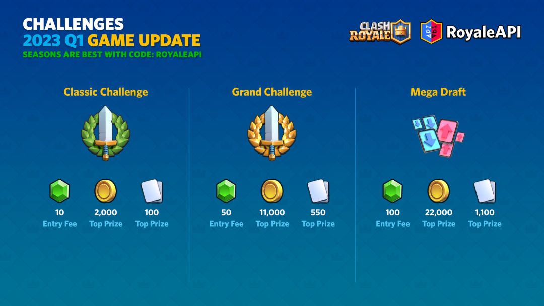 值得注意的是,终极挑战的入场费从100宝石降到了50宝石,奖励也只有原来的一半。超级选卡挑战取代了原先终极挑战的位置。