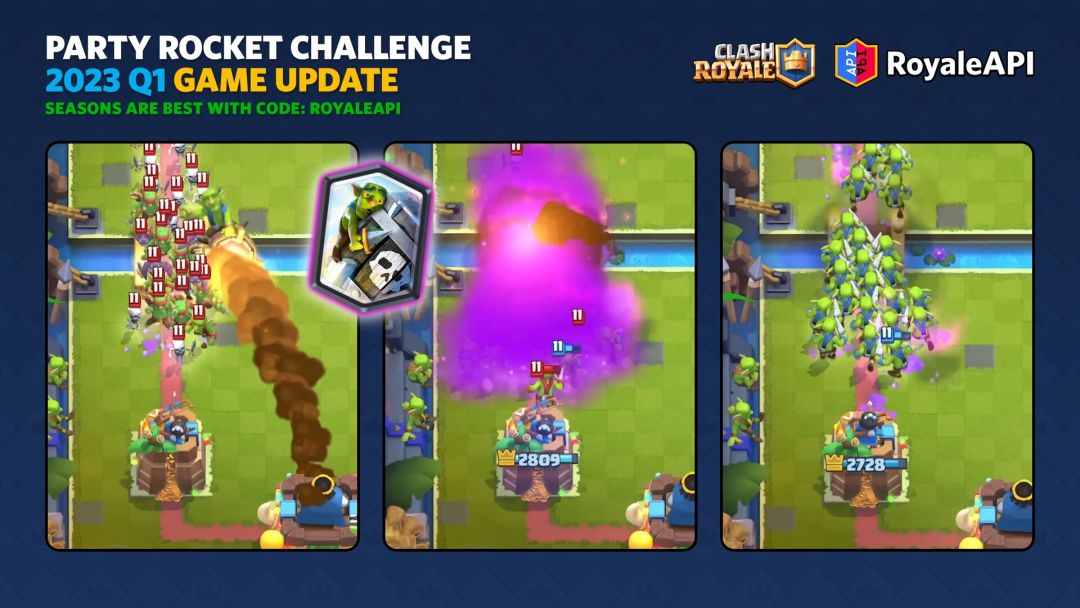 Party Rocket是一张5费卡,攻击范围比一般的火箭要小一点。任何被火箭炸死的单位都会转为哥布林。
