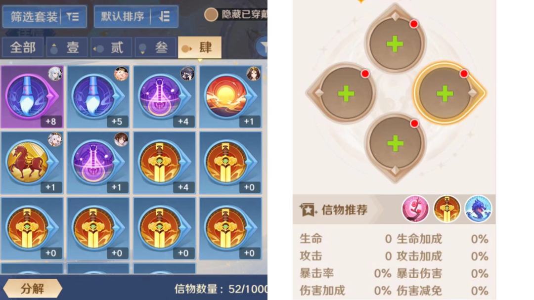 信物在自在西游游戏中对于神将而言是非常重要的,一共有12套信物。当主角达到37级时游戏会开启信物系统,在给神将的信物搭配也是很讲究的,搭配的好一招秒杀,搭配不好犹如刮痧,会影响到神将的输出,所以选择合适的信物是非常重要的。信物也和神将一样分为:蓝、紫、橙、红四个等级品质由低到高,低品质的信物是无法升级为高品质信物的,但是多余的信物可以分解。信物一共有四个位置:壹、贰、叁、肆,分别对应上下左右四个位置。而四个位置代表的又各不相同;壹代表的是生命值;贰代表的是攻击、生命、伤害、减伤中的一种;叁代表的是攻击;肆代表的是攻击、生命、暴击率、暴击伤害、治疗加成中的一种。