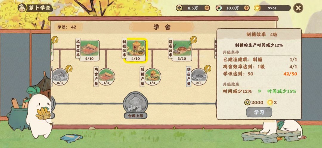第三个要优先加点的是制糖效率,在金钱和“念”充足的情况下将制糖提升到4级,此时制糖效率也提升了12%。