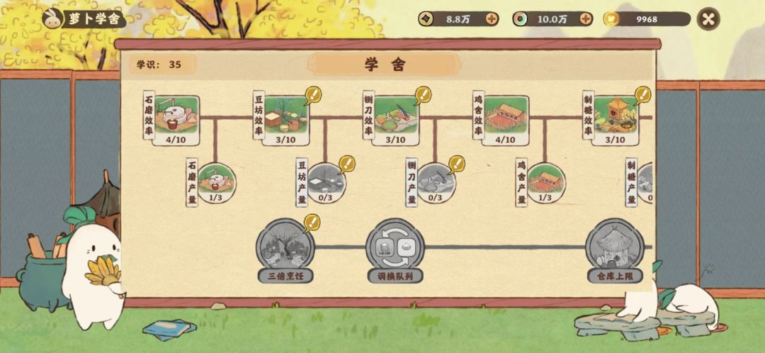 最后要说一下“学识”板块,它出现在学舍左上角,体现的是我们对萝卜学舍各项技能的加点总数,技能升级后,学识也会增加。一些技能在升级到一定程度后,会要求学识达到一定程度才可继续升级,所以在技能的加点上不能专注加点一个技能哦~