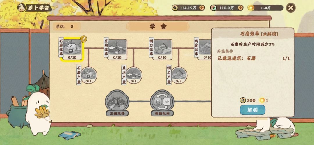 这个时候我们着重加点石磨效率和鸡舍效率,其他效率能加则加主要用于曾加学识,将石磨和鸡舍升到4级,优先解锁石磨产量和鸡舍产量,此时石磨和鸡舍的生产效率提高了12%,而且还有8%的概率产出两份物品,大大缓解了前期鸡蛋和面粉的压力。