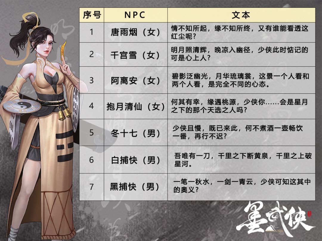 本次的文案依旧是来自游戏内的7个NPC的对话文本,每句话都是摘取自游戏内展示的真实文本哦~各位少侠可以在下面的表格内自行选择喜欢的句子,录制成音频后发送给我们,师姐和小师妹评选过后,最为优秀的那位少侠录制的语音有机会会在游戏中被NPC使用哦~