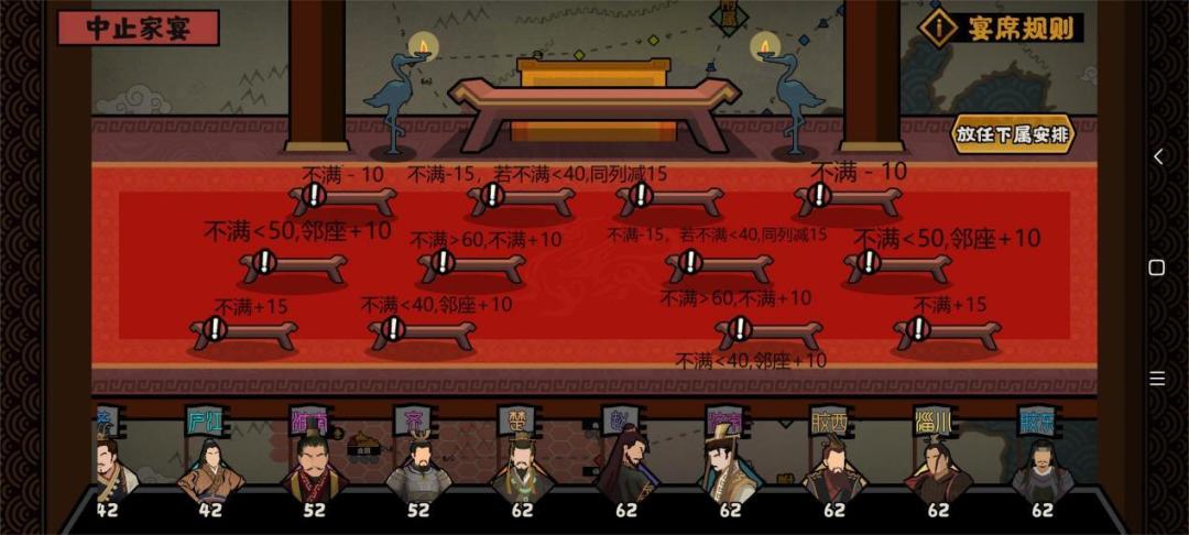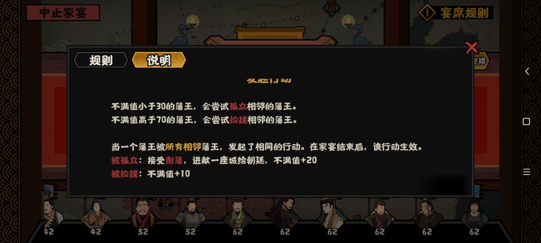 家宴初始条件要求威望在80以上,第一次开始家宴,之后的家宴是在每一年都会有一次(前提:不会叛变)。其中注意的是吴王表示拒绝参加家宴,他怕忍不住打死景帝(设想情景)。