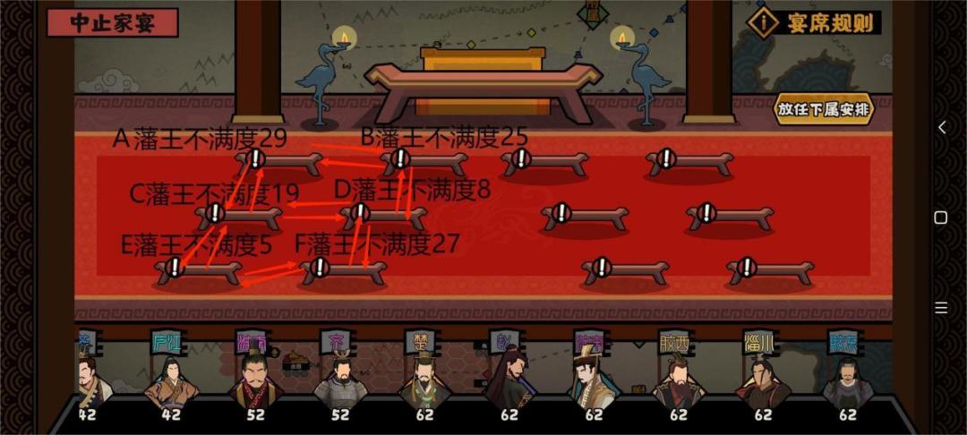 我就拿这个图来举例说明孤立的操作方式,这里A—F藩王不满度都是在30以下的,因此A藩王能被B、C同时孤立触发夺城;B藩王被A、D同时孤立触发夺城;C藩王被A,D,E同时孤立触发夺城;D藩王被B、C、F同时孤立触发夺城,同理E、F也是如此。相反拉拢也如同上面的操作一样只不过是反向操作了而已。其中要注意的是第二列和第三列这两列不会有任何孤立和拉拢操作,因为2、3列是独立的。而孤立成功获得被孤立国家的城池,但是会加该国的20不满度,建议谨慎使用。拉拢是在70不满度以上触发,对邻近国家加15不满度。虽然有座位帮助降低不满度,但是最好不要超过70不满度,否则叛变机率非常大的。