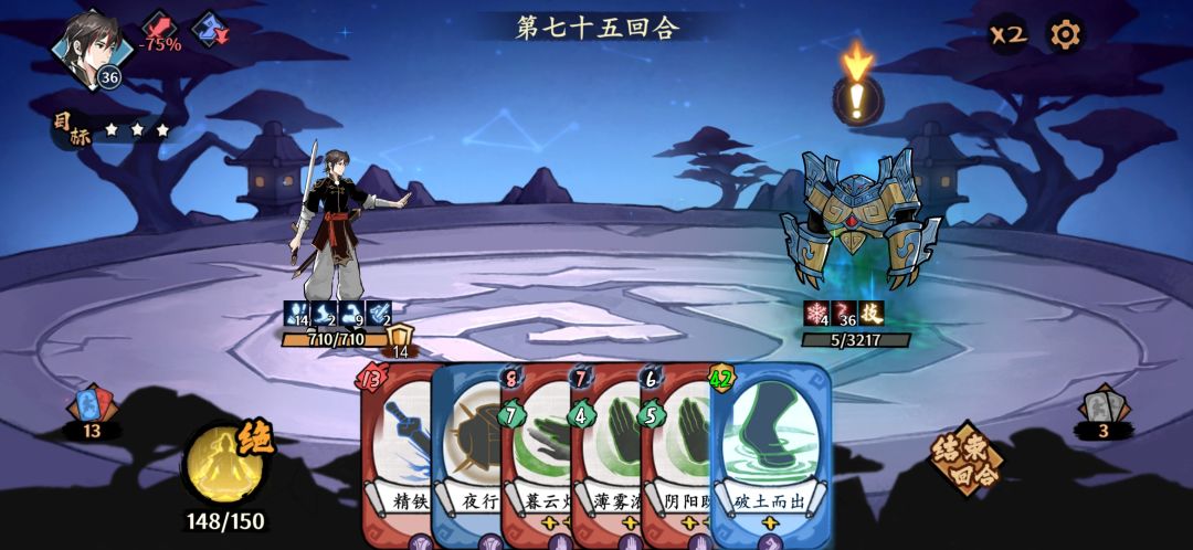 打法核心其实就是北冥流的暗伤,暗伤是下一回合初结算,不会触发乌龟反伤,叠上去慢慢耗死乌龟就行,注意点就是:刚开始两回合尽量叠暗伤,之后用蓝色带绿色暗伤数字的轻功,内力牌去叠就行,熟练了就点的很快。(注意一回合别用超过6张牌)